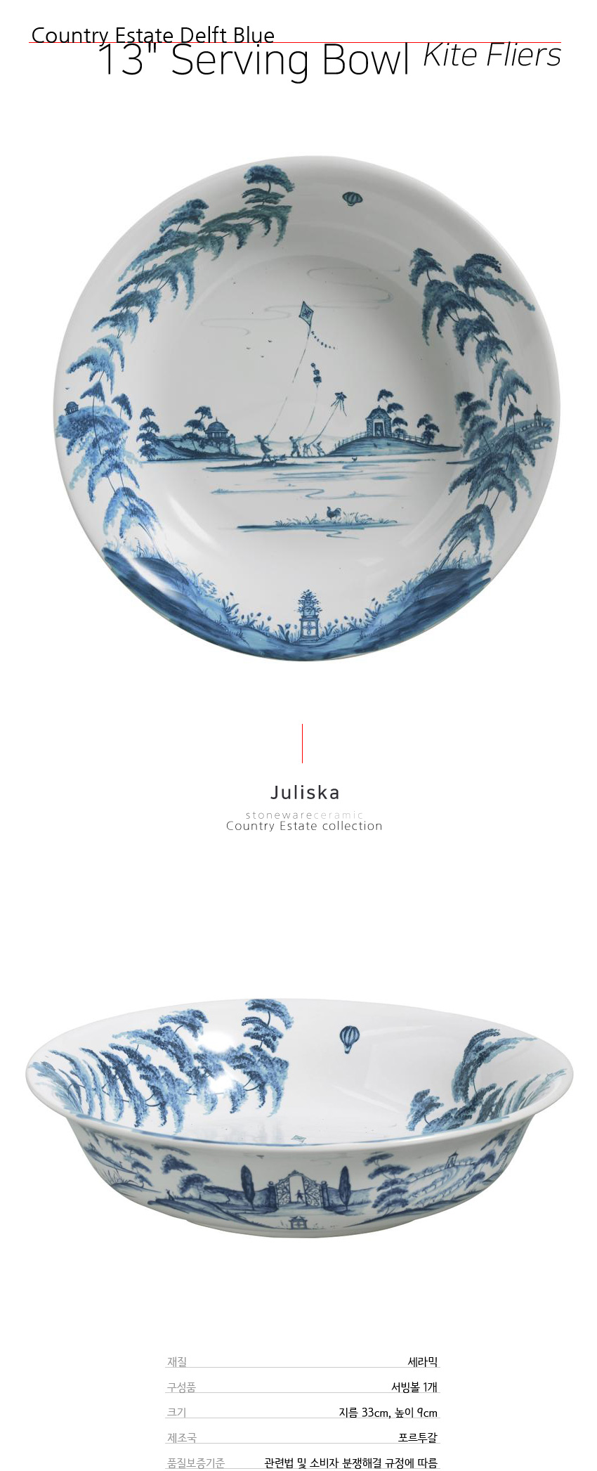 줄리스카 컨트리 불루 지름 38cm 서빙 볼 (Country Estate Delft Blue 13" Serving Bowl 'Kite Fliers')