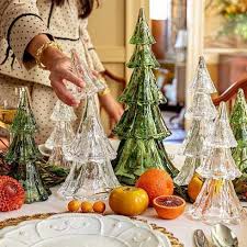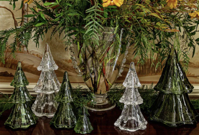 입으로 불어 만든 투명 유리 트리 세 개 세트는 베리와 실 장식으로 꾸며져 있으며,